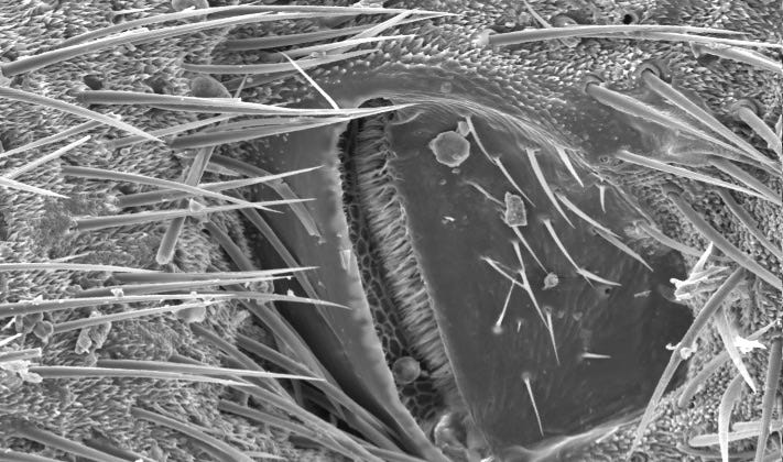 Electron microscope image (342x magnification) of tiny setae on the body of a cricket, on and surrounding a spiracle valve (breathing hole).